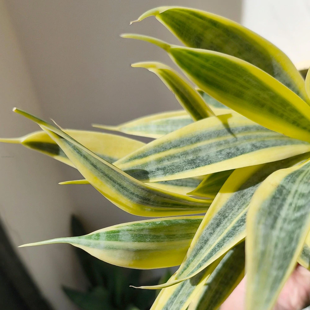 Tahle sansevierie vypadá, jako by ji někdo lehce pocukroval stříbrným prachem. Kultivar 'Yellow Thrive' zaujme jemně krémovými okraji listů, které kontrastují se světlounce zeleným středem. Celý list působí sametově matným dojmem, což jí dodává výjimečně elegantní vzhled.